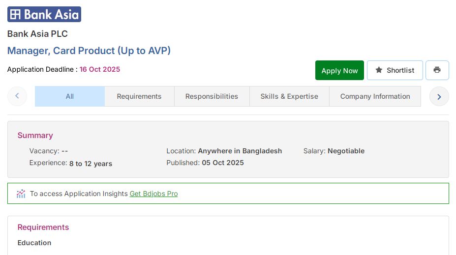 Bank Asia Limited Job Circular 2025. Bank Asia is one of the best commercial Bank in Bangladesh. Recently published Bank Asia Limited Job Circular. Bank Asia Ltd. (BAL) Career to build a long-term sustainable financial institution through financial inclusion and deliver optimum value to all stakeholders with the highest level of compliance. Bank Asia is a contemporary, upbeat brand of distinctive quality of service and solution that offers a rewarding banking experience as the preferred choice of banking partner every time.